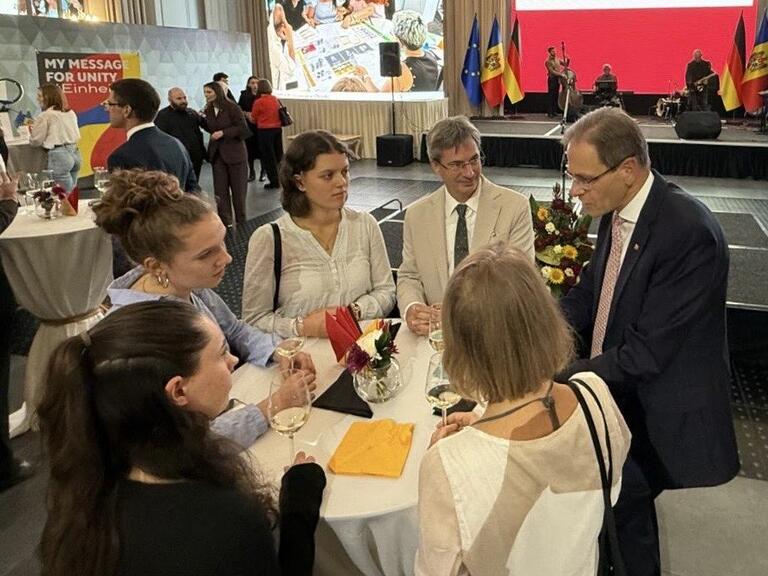 Wir waren in diesem Jahr anlässlich des Tags der deutschen Einheit zum Empfang der deutschen Botschaft in Moldau eingeladen. Für unsere Arbeit mit den Kindern ist es wichtig zu wissen, wie sich das Land entwickelt, und was für die Kinder und ihre künftige Ausbildung essenziell ist. Auf dem Empfang war es möglich, nicht nur im direkten Gespräch mit dem deutschen Botschafter Hubert Knirsch mehr zu diesen Themen zu erfahren (s. Bild 4), sondern auch in einer Unterhaltung mit dem Präsidenten des moldauischen Parlaments Igor Grosu.
